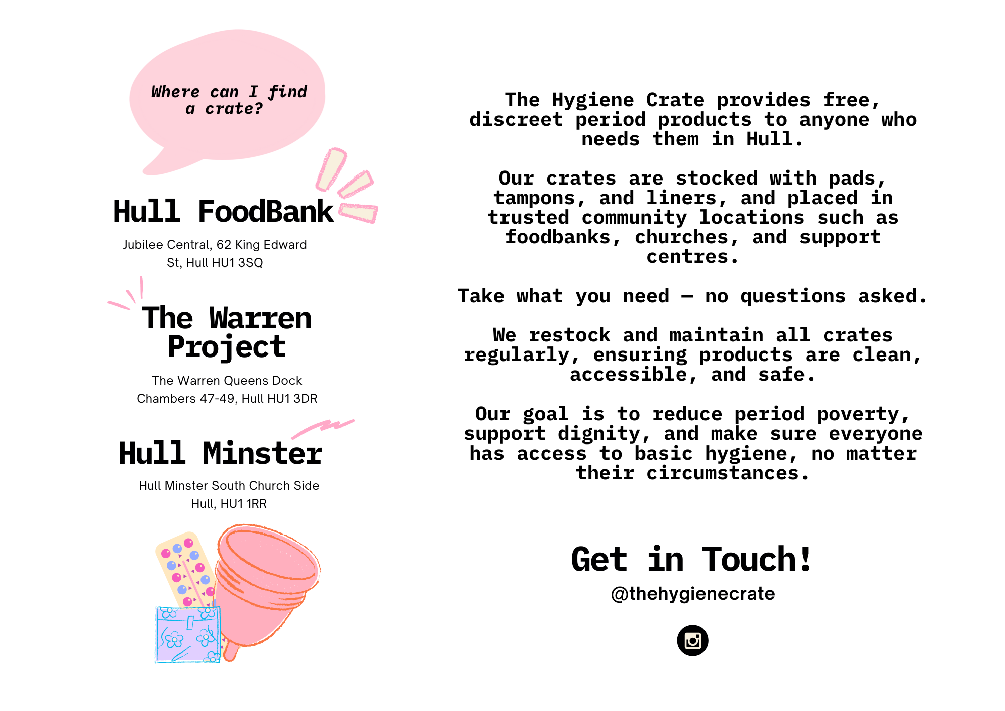 Hull Minster now provides sanitary products for women who cannot afford to buy them. Courtesy of @thehygienecrate If you would like to donate any products (complete packets only please), you can hand them to a member of our team at Hull Minster. Thank you for your support.
